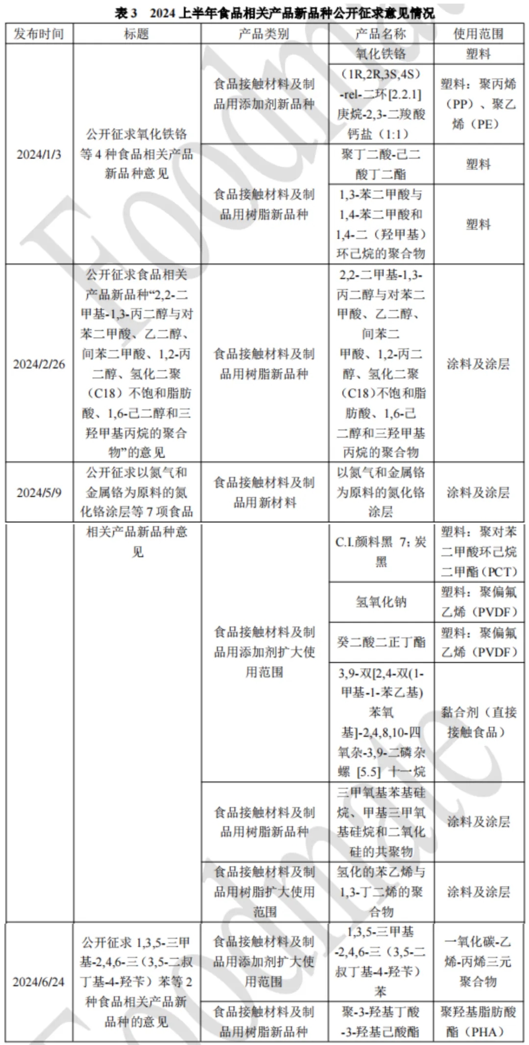 2024年上半年,国家卫健委共批准5种食品相关产品新品种(2024年第2号公告),包括食品接触材料及制品用添加剂新品种2种、食品接触材料及制品用树脂新品种2种、食品接触材料及制品用树脂扩大使用范围1种,详情见表4。
