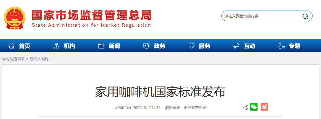 近日,市场监管总局(国家标准委)批准发布《家用和类似用途咖啡机》(GB/T 46503—2025)国家标准,将于2026年5月1日起正式实施。该标准围绕咖啡机的通用性能、特定参数、使用体验等提出了技术要求,旨在提升产品质量水平,方便消费者选购与使用,引导行业健康有序发展。