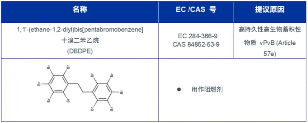2025年11月5日,欧盟化学品管理局(ECHA)应欧盟委员会的要求,将提议的1项物质十溴二苯乙烷(DBDPE)添加到为用于授权的高度关注物质(substances of very high concern,SVHCs)清单候选列表中,至此候选物质清单包含了251项物质。这是2025年SVHC进行的第三次更新。