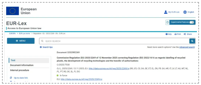 2025年11月12日,欧盟委员会通过法规(EU)2025/2269,对现行食品接触用再生塑料法规(EU)2022/1616进行更正。该更正法规旨在澄清和修正原法规在实施过程中发现的错误,涉及标签、新技术开发、授权转移及评估程序等多个关键领域,以确保法律执行的准确性和明确性。本次技术性修正主要内容包括: