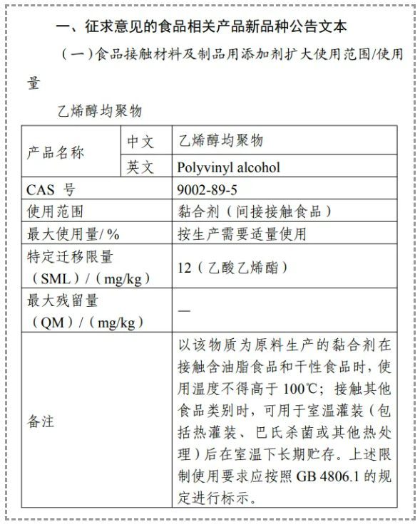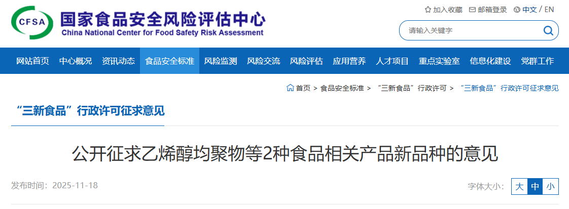 根据《食品相关产品新品种行政许可管理规定》和《食品相关产品新品种申报与受理规定》要求,乙烯醇均聚物等2种食品相关产品新品种已通过专家评审委员会技术评审(具体情况见附件)。现公开征求意见,请于2025年12月18日前将书面意见反馈至邮箱,如在截止日期前未反馈相关意见,视为无不同意见。
