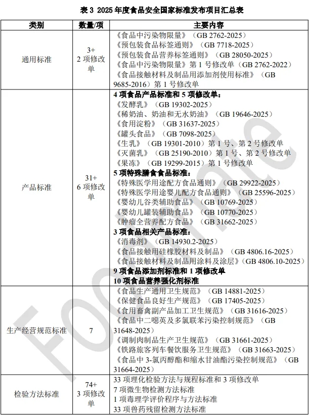 2025年,国家卫生健康委员会以及其他相关部门共发布3批次食品安全国家标准发布公告,涉及115项食品安全国家标准和11项修改单,数量较上一年有所增加。在通用标准方面,重点规范了食品标签标识,修订了肉类干制品等污染物限量;在产品标准方面,围绕乳制品、特殊医学用途配方食品、食品接触用硅橡胶材料等重点食品类别,系统修订并发布了多项产品标准;在生产经营规范标准方面,新版《食品生产通用卫生规范》(GB14881-2025)正式发布,全面完善了食品生产各环节的基本卫生要求,新增寄生虫控制、致敏物质管理、HACCP原理及其应用指南等关键内容;在检测方法标准方面,更新完善了理化、微生物及农兽药残留检测方法。2025年度食品安全国家标准发布项目汇总表,见表3。