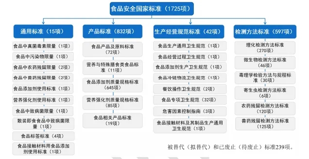 截至2025年9月,我国共发布食品安全国家标准1725项,食品安全国家标准由通用标准、产品标准、生产经营规范标准、检验方法与规程标准4大类别的标准组成。各类标准有机衔接、相辅相成,从不同角度管控食品安全风险,共同组成食品安全国家标准体系,详见图1。其中通用标准15项、食品产品标准72项、特殊膳食食品标准11项、食品添加剂质量规格及相关标准645项、食品营养强化剂质量规格标准85项、食品相关产品标准19项、生产经营规范标准42项、理化检测方法标准270项、寄生虫检测方法标准6项、微生物检测方法标准46项、毒理学检验方法与规程标准30项、农药残留检测方法标准120项、兽药残留检测方法标准125项、被替代(拟替代)和已废止(待废止)标准239项。