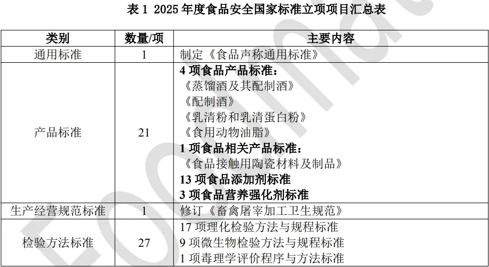 2025年,国家卫生健康委先后印发了《2025年度食品安全国家标准立项计划》及第二批立项计划,全年共立项50项标准,涵盖通用标准、产品标准、生产经营规范标准以及检验方法标准四大类别,内容涉及食品声称、添加剂、蒸馏酒及其配制酒、畜禽屠宰加工、食品接触材料等多个重点领域。2025年度食品安全国家标准立项项目汇总表,见表1。